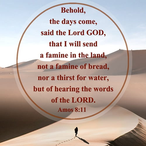 “主耶和华说,日子将到,我必命饥荒降在地上,人饥饿非因无饼,干渴非因无水,乃因不听耶和华的话。他们必飘流,从这海到那海,从北边到东边;往来奔跑,寻求耶和华的话,却寻不着。”(摩八11-12)