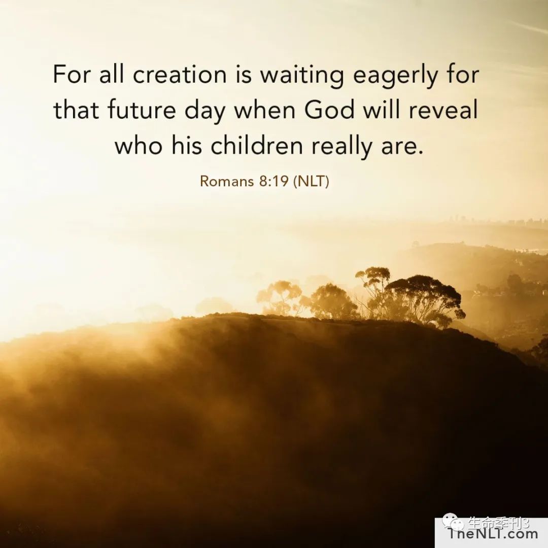 虽然一切受造之物服在虚空之下,但是神的众儿女可以在这个世界上把神的荣耀显明出来,我们可以活出丰盛,活出意义,活出一个充满了神的尊贵荣耀、满有神形象的人生。这里用一个拟人的手法来表达,整个自然界都在等候、盼望,期待着神的众子可以把神的荣耀、神的丰盛、神的爱在这个世上显明出来,就像在黑暗中切望日出一样。这就是神的计划、神的心意。