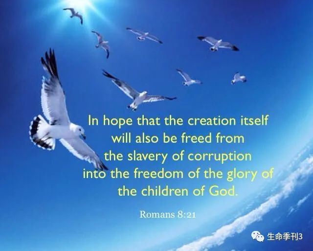 罗马书8:21节:“但受造之物仍然指望脱离败坏的辖制,得享神儿女自由的荣耀。”
