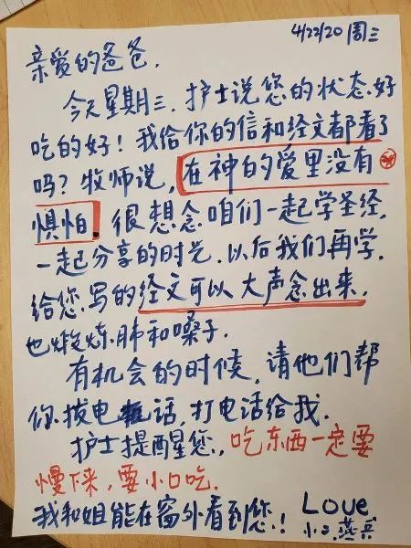 自从爸爸在医院里拔管清醒以后,我每天给爸爸写信。我很珍惜这个写信的过程,这样的交流是我能为他做的不多的事情之一。在信里我告诉爸爸日期、病情的进展、治疗方案等等。最重要的是我每天给爸爸写圣经的经文和祷告,用上帝的话语来鼓励他,告诉他我们爱他,神爱他,一定要坚持住。爸爸每天也非常期待我的信。