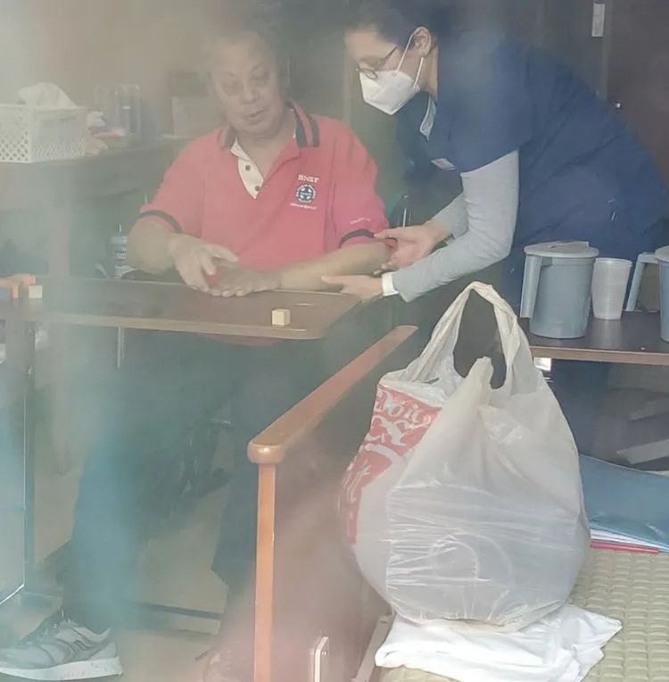 这是我在窗外看到 Terri 帮助爸爸练习上肢功能。