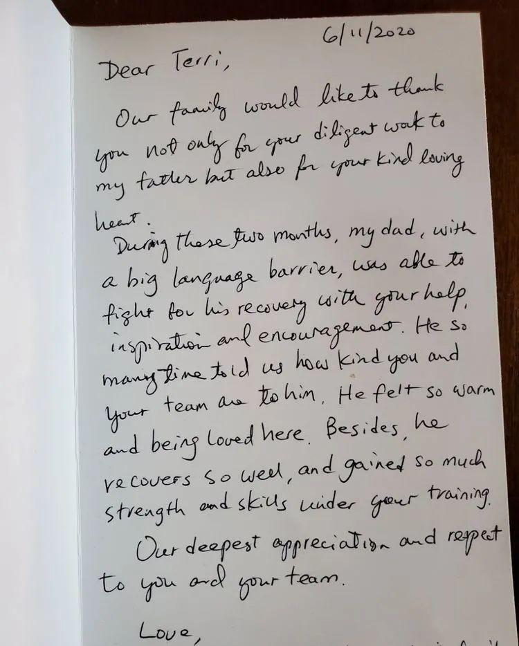 有一位康复师叫 Terri, 她对爸爸特别好,充满了爱心和耐心。她每周帮助爸爸洗澡。爸爸生病很长时间没有洗脚了,她给爸爸泡脚,搓脚,自己买了指甲刀给爸爸剪指甲。爸爸和我们都觉得她就像上帝派给爸爸的天使一样保护关爱爸爸,鼓励他锻炼。我们对她的感激是语言无法表达的。