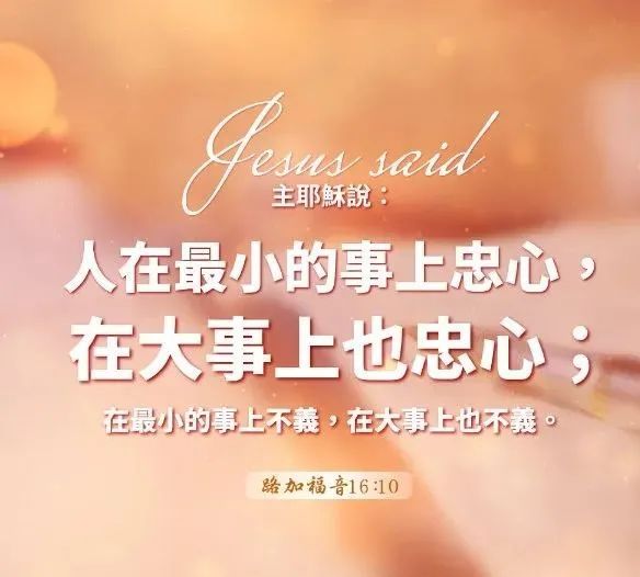 今日经文:“人在最小的事上忠心,在大事上也忠心;在最小的事上不义,在大事上也不义。”(路十六10)