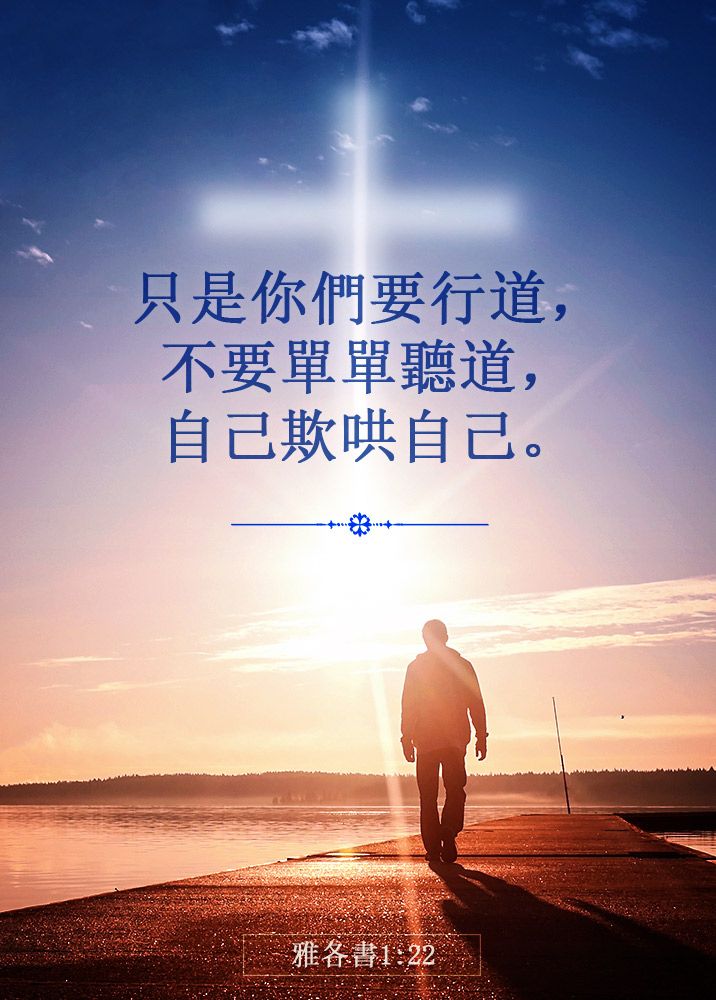 祷告:亲爱的主,谢谢你借着雅各提醒我们,听道而不行道,生命就得不着益处。虽然行道是一件艰难的事,但我们相信,你的灵借着你的道,在我们生命中做工,必能叫我们得着活出真道的生命能力。荣耀归主!奉基督的名,阿们!