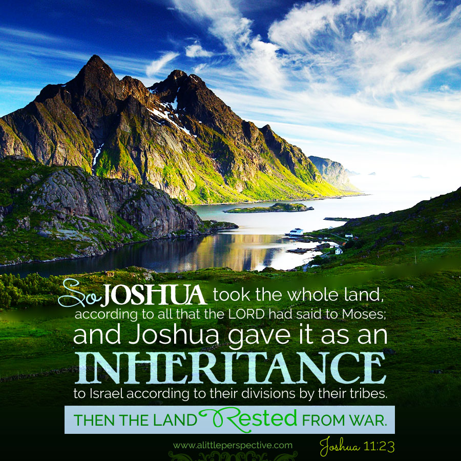 “当时约书亚来到,将住山地、希伯仑、底璧、亚拿伯、犹大山地、以色列山地所有的亚衲族人剪除了。约书亚将他们和他们的城邑尽都毁灭。在以色列人的地没有留下一个亚衲族人,只在迦萨、迦特,和亚实突有留下的。这样,约书亚照着耶和华所吩咐摩西的一切话夺了那全地,就按着以色列支派的宗族将地分给他们为业。于是国中太平,没有争战了。”(书11:21-23)