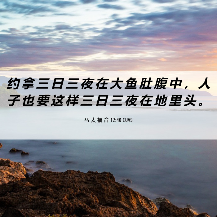 “耶稣回答说,一个邪恶淫乱的世代求看神迹。除了先知约拿的神迹以外,再没有神迹给他们看。约拿三日三夜在大鱼肚腹中,人子也要这样三日三夜在地里头。当审判的时候,尼尼微人,要起来定这世代的罪,因为尼尼微人听了约拿所传的,就悔改了。看哪,在这里有一人比约拿更大。”(太12:39-41)