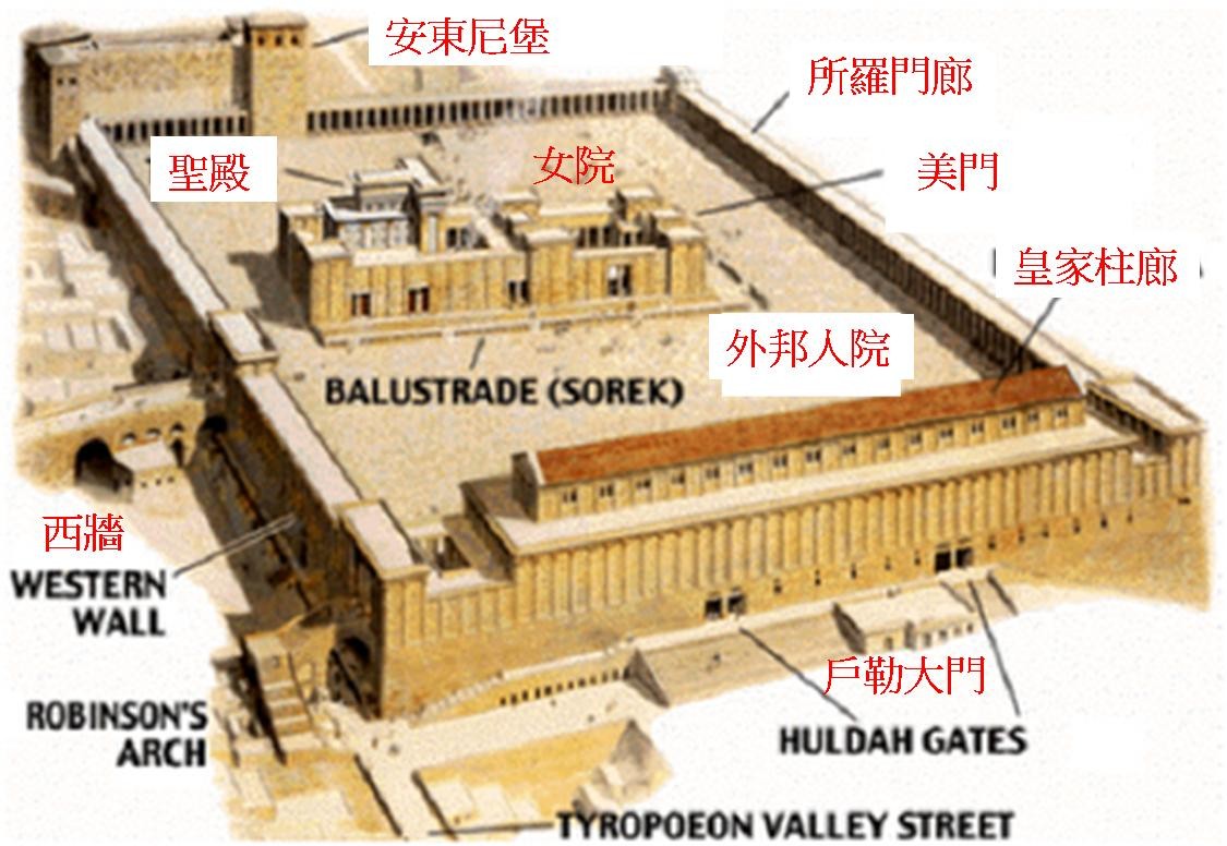 圣殿从外往里分为外邦人院(外院),以色列女人院、男人院、祭司院(总称为内院),然后是圣所与至圣所。至圣所只有以色列大祭司每年只能进入一次。