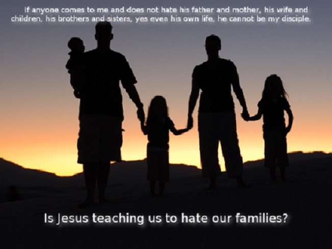 主耶稣的意思并不是教训我们恨恶家中的人,乃是告诉我们要为祂的缘故轻看他们,把祂放在最前面,却把所爱的一切人放在其次。祂不是不许我们爱父母,乃是要我们爱祂超过爱父母。祂也不是禁止我们爱儿女,乃是要我们爱祂超过爱儿女。爱父母是应当的,但如果爱父母过于爱主,便不能作主的门徒了,爱儿女是合理的,但如果爱儿女过于爱主,便不能作主的门徒了。至于爱妻子,弟兄,姊妹,和自己的性命,也都是一理。将主放在第一,把其他一切的人放在第二。如果二者不能兼顾的时候,只能舍弃自己所爱的人,却不能舍弃主;这便是恨自己的父母,妻子,儿女,弟兄,姊妹,和自己的性命了。容我们再读一段经文──