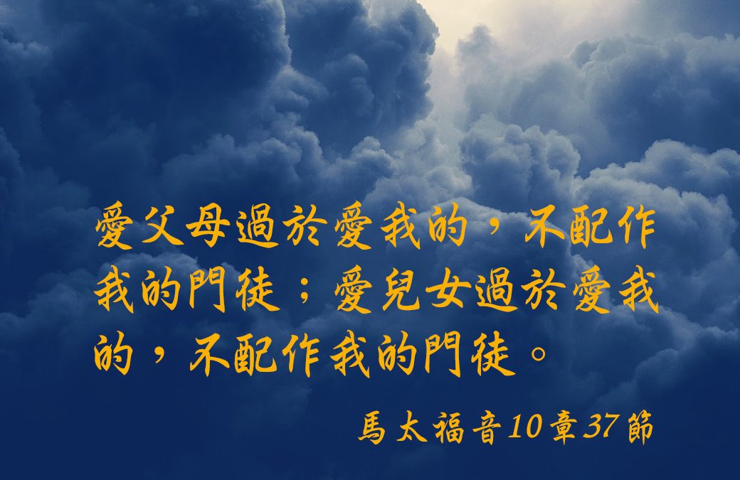 “爱父母过于爱我的,不配作我的门徒;爱儿女过于爱我的,不配作我的门徒;不背着他的十字架跟从我的,也不配作我的门徒。”(太十37-38)