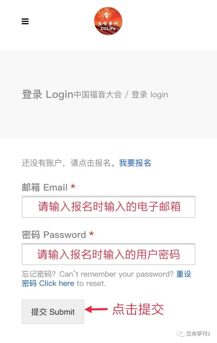 4. 点击登录后,请在页面中输入您的电邮地址和密码(就是您在报名注册时候使用的邮箱及密码),请参下图: